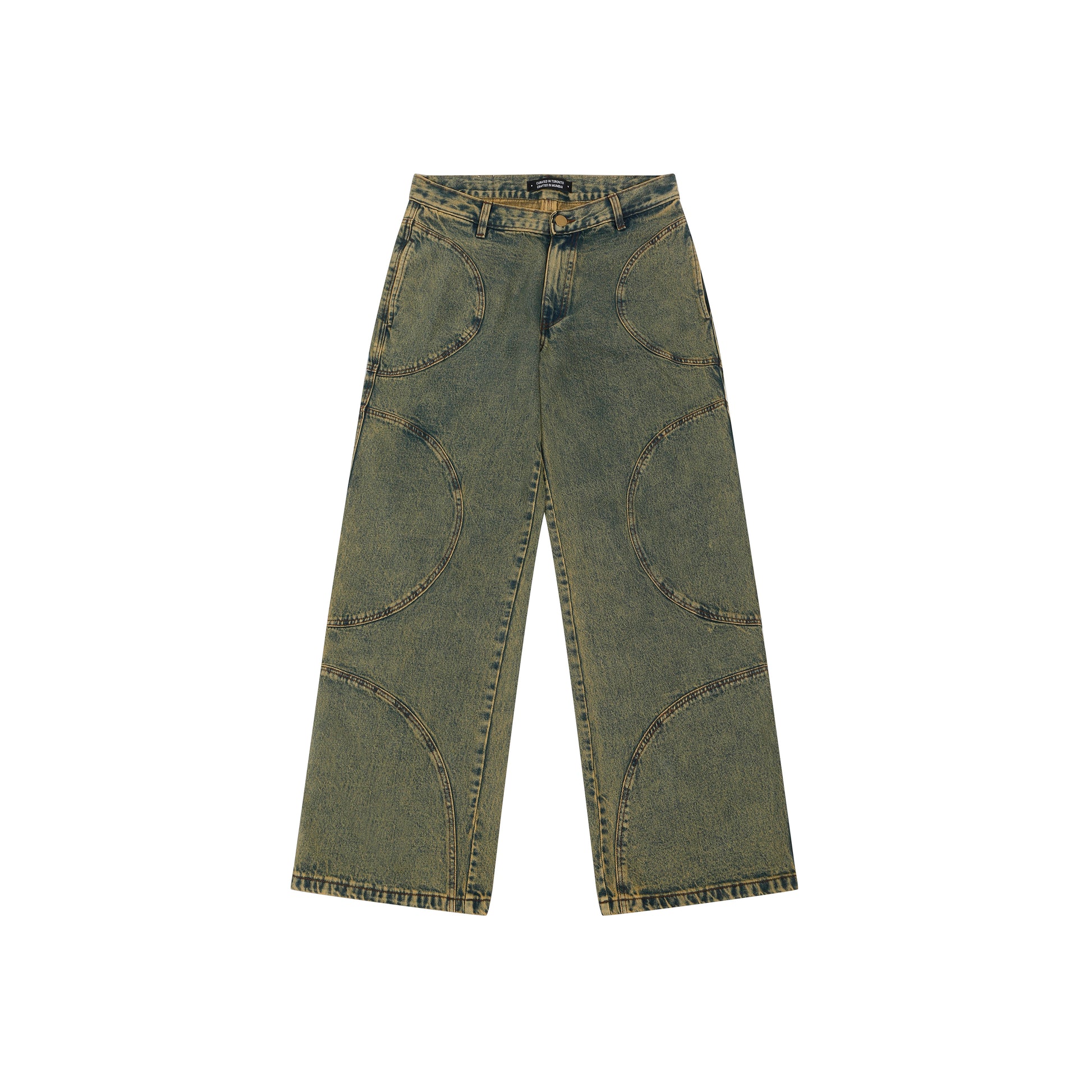 CIRCULAR ORBITAL STITCH DETAILING RUNS ACROSS THE LEGS - SUBTLE, BUT IMPOSSIBLE TO IGNORE. WIDE-LEGGED FIT. FINISHED WITH THE SIGNATURE MISSNG TILE DENIM TAG ON THE BACK.